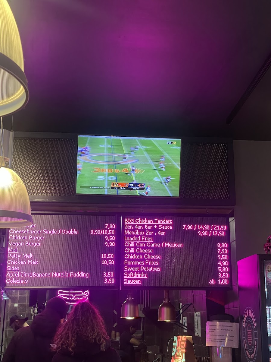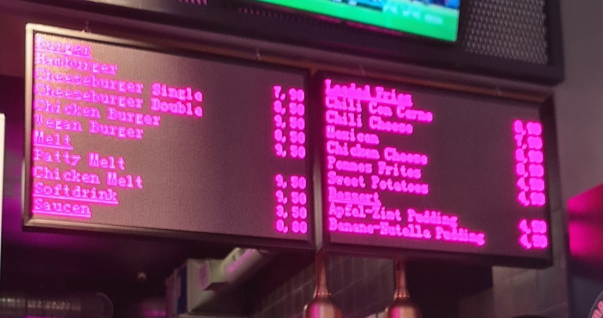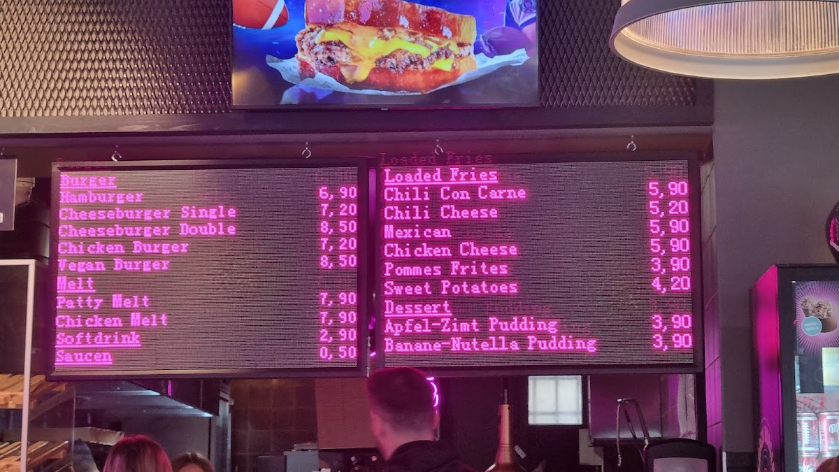 Visitors will find highlights like the rich Patty Melt Cheeseburger, the crispy Chicken Cheese Fries, and distinctive loaded options such as Chili Cheese Fries or Pommes mit Chili Con Carne. The menu balances familiar favorites like single and double cheeseburgers with inventive touches that add extra character to the experience.